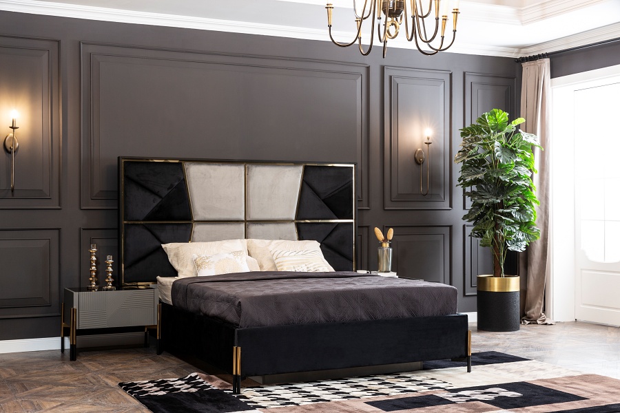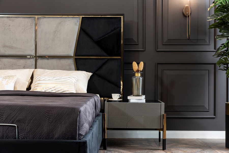 Patul este tapitat cu material catifelat nuanta albastru inchis