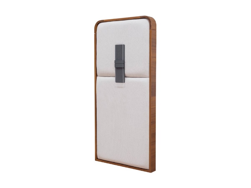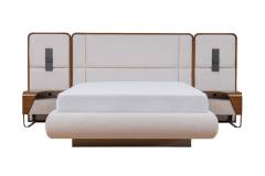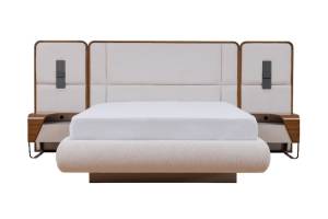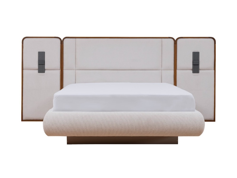 Patul este tapitat cu material textil nuanta crem in combinatie cu nuanta lemnului.