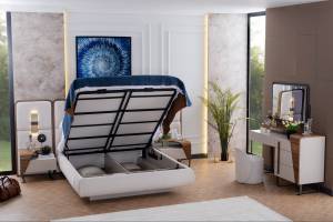 Patul este prevazut cu spatiu pentru depozitare tip lada si cu somiera (sistem de rabatare cu pistoane pe gaz)