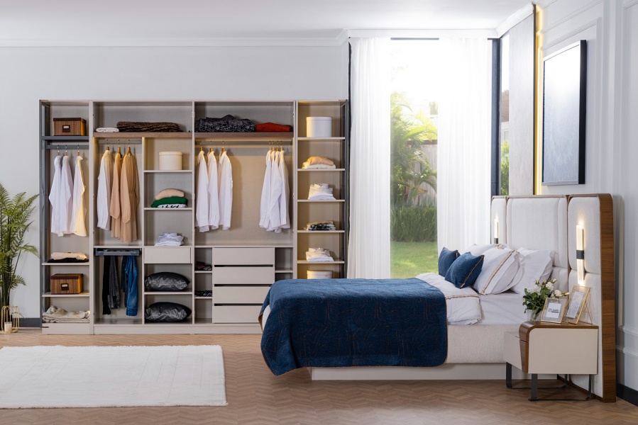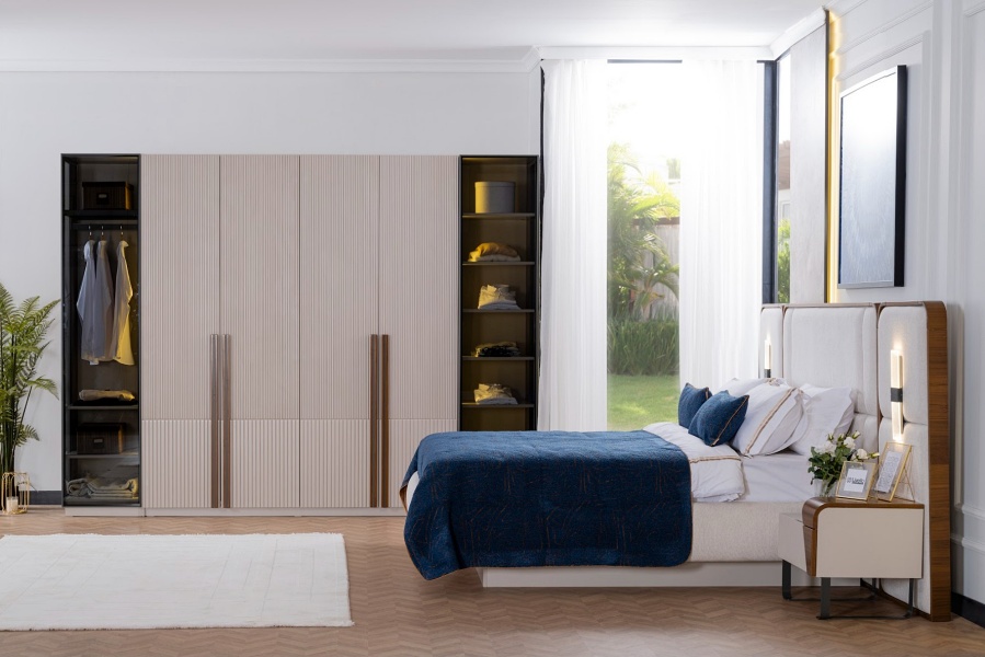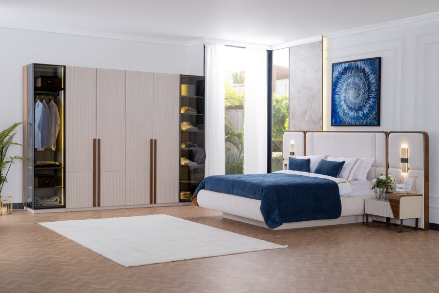 Setul contine: un dulap cu 6 usi (4 usi decor + 2 usi sticla), un pat 160x200cm, o comoda + oglinda, un taburet, 2 noptiere, 2 tablii de la noptiere