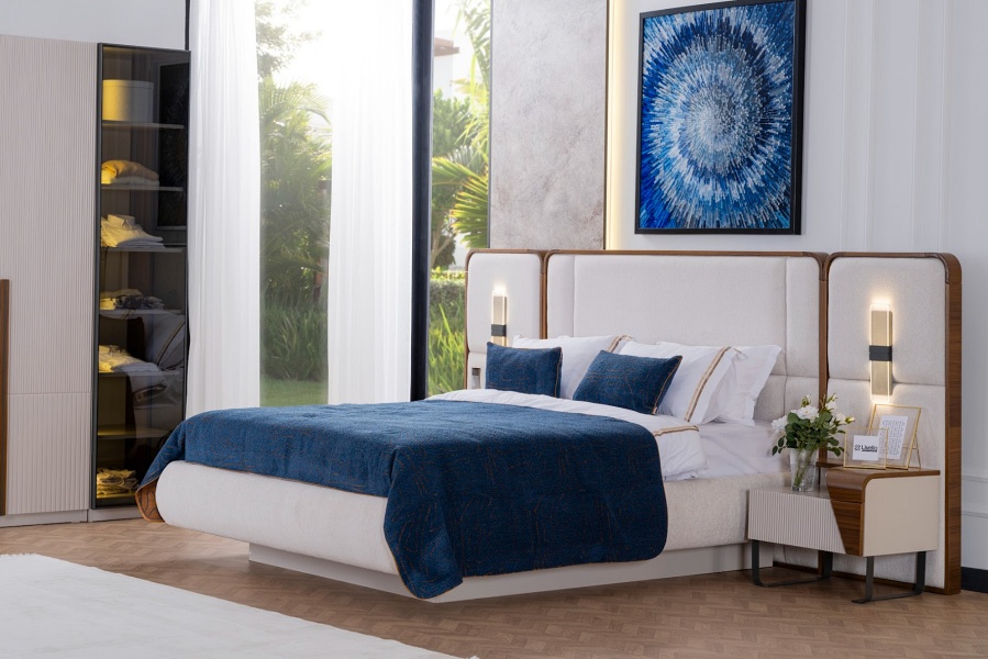 Patul este tapitat cu material textil nuanta crem in combinatie cu nuanta lemnului.