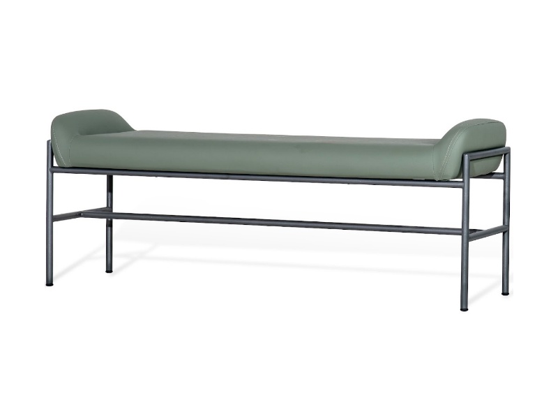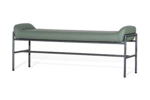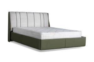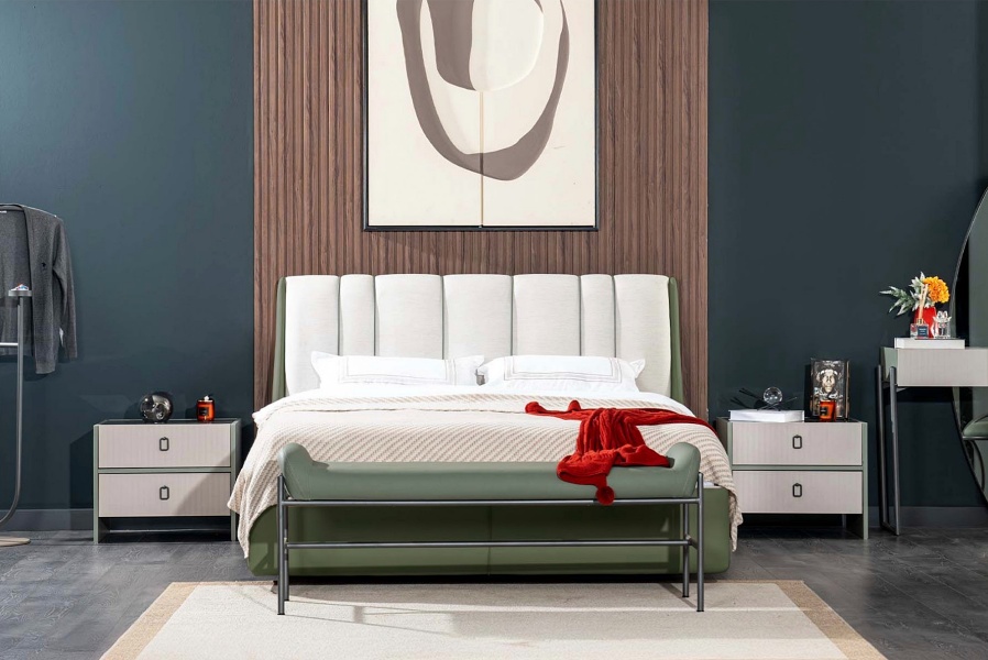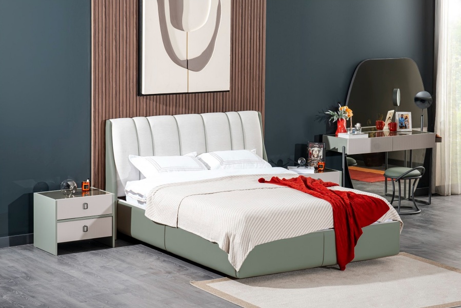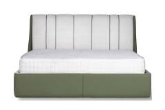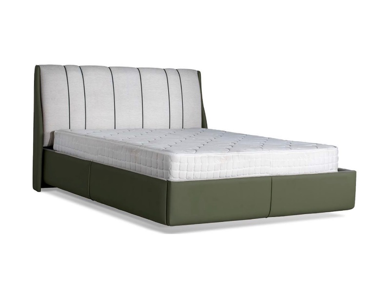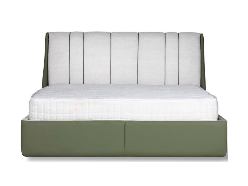 Patul este tapitat cu material textil in combinatie cu ecopiele verde sage.