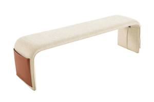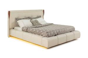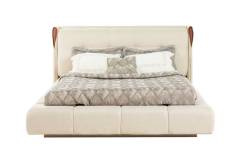 Patul este tapitat cu material textil in combinatie cu ecopiele crem + maro.