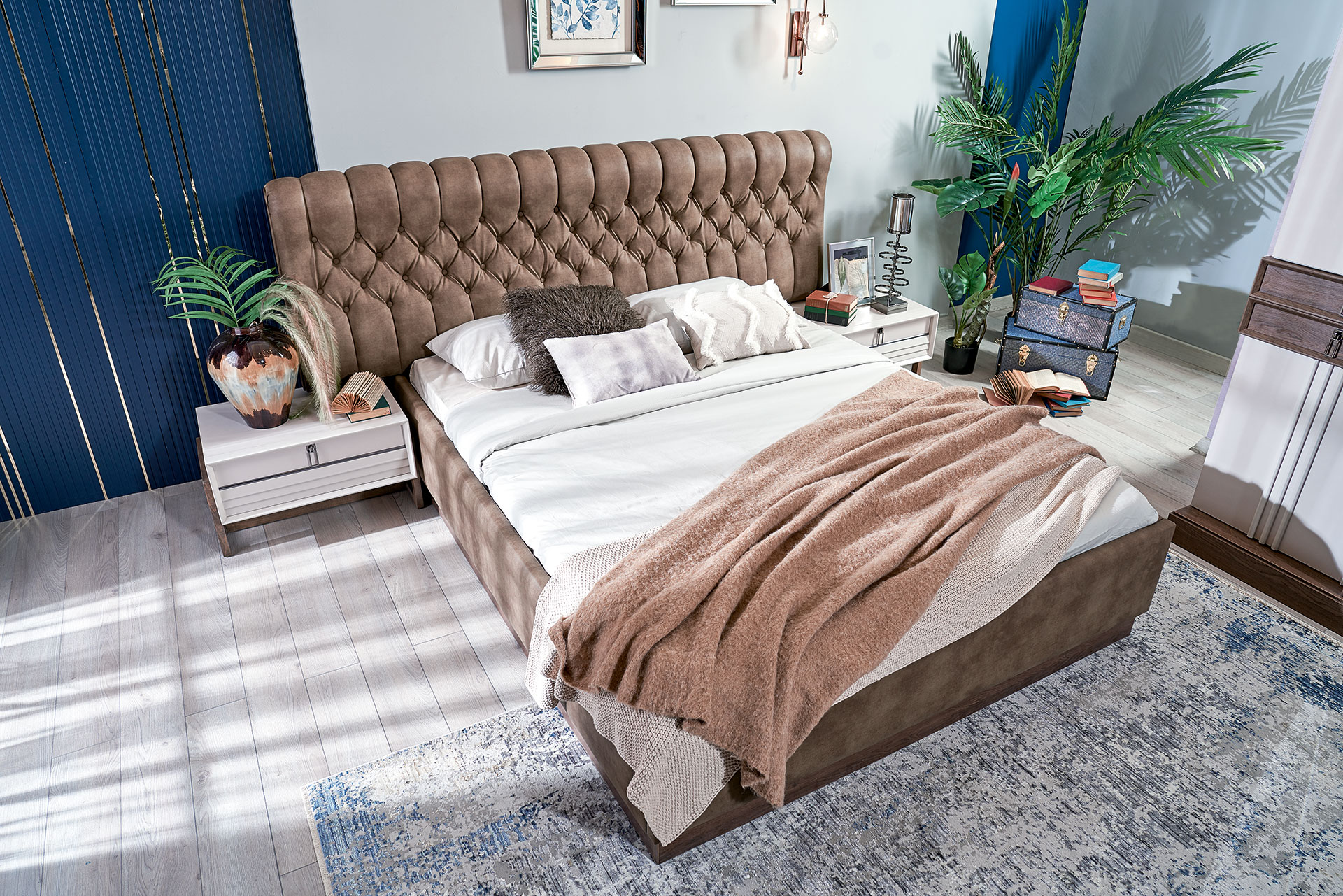 Patul este prevazut cu spatiu pentru depozitare tip lada si cu somiera (sistem de rabatare cu pistoane pe gaz)