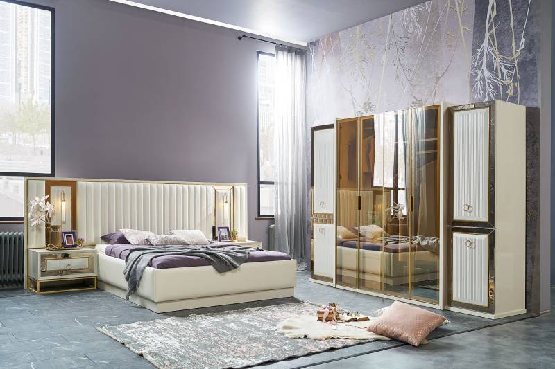 Setul contine : un dulap, un pat 160x200cm, o comoda + oglinda + taburet, 2 noptiere