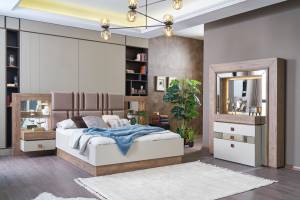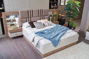 Tablia patului este tapitata cu material textil nuanta maro deschis.