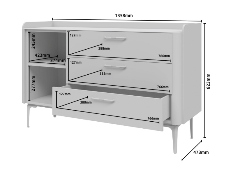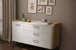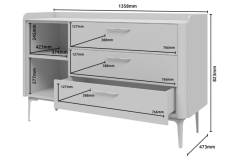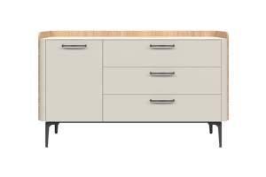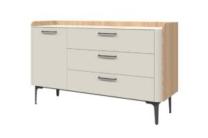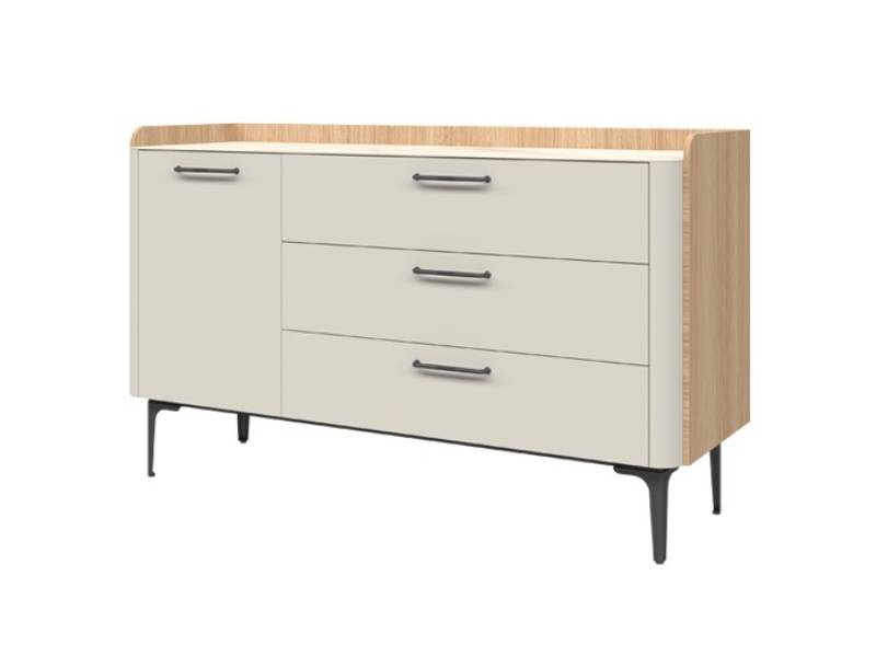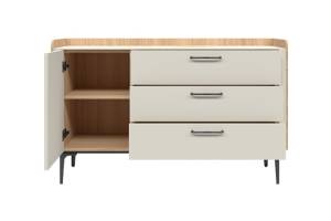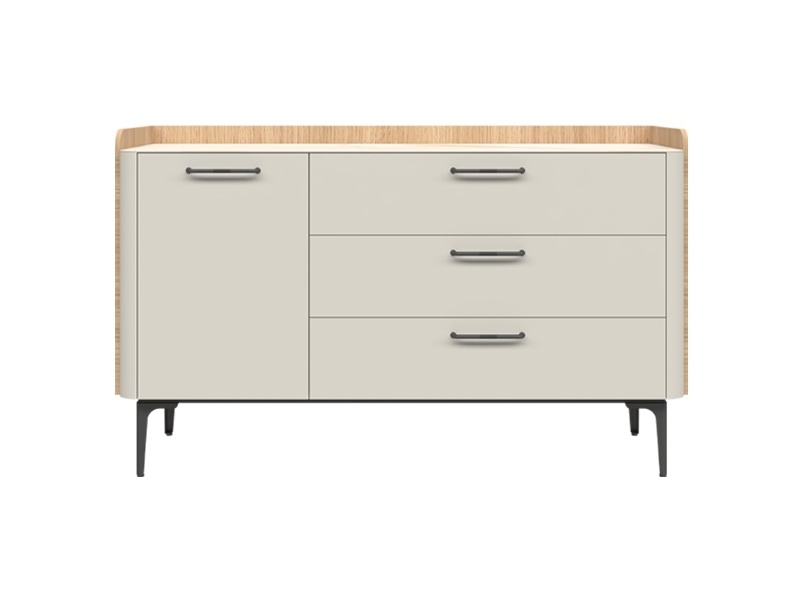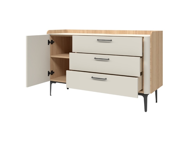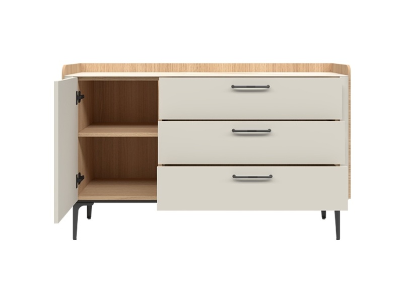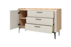Comoda cu 1 usa si 3 sertare AIR 118x86x45cm Pepper White/ Stejar Furneo - sticla cu model de marmura Calcatta Oro, cadru, manere si picioare Antracit