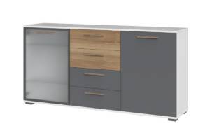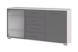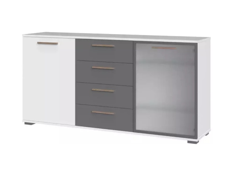- comoda are 2 usi (1 usa decor grafit mat + 1 usa sticla sablata) + 4 sertare ( 2 sertare decor grafit mat + 2 sertare Nuc Pacific)
