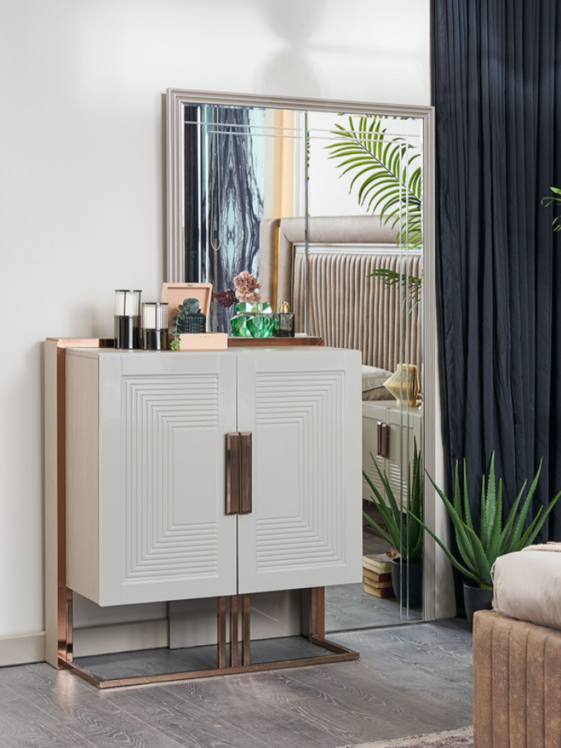 Materiale folosite la productie: MDF (partile principale), PAL, oglinda, metal, material textil, sticla