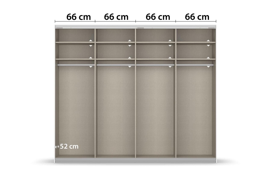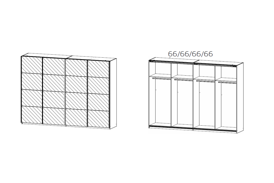- Dulapul are inclus 2 polite si 1 bara pentru umeras pentru fiecare compartiment, in total 8 polite 66x48cm si 4 bare pentru umerase.