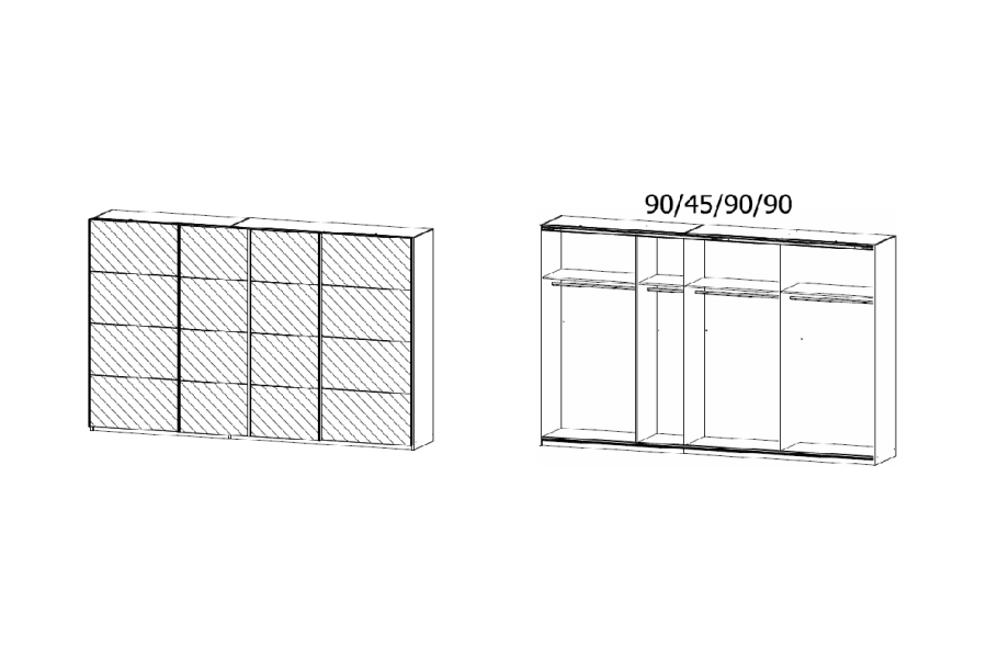 - Pentru compartimentele de 90cm dulapul are inclus 2 polite si 1 bara pentru umeras, in total 6 polite 88x48cm si 3 bare pentru umerase.