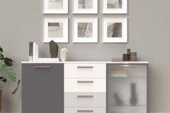- comoda are 2 usi (1 usa decor grafit mat + 1 usa sticla sablata) + 4 sertare ( 2 sertare decor grafit mat + 2 sertare Nuc Pacific)