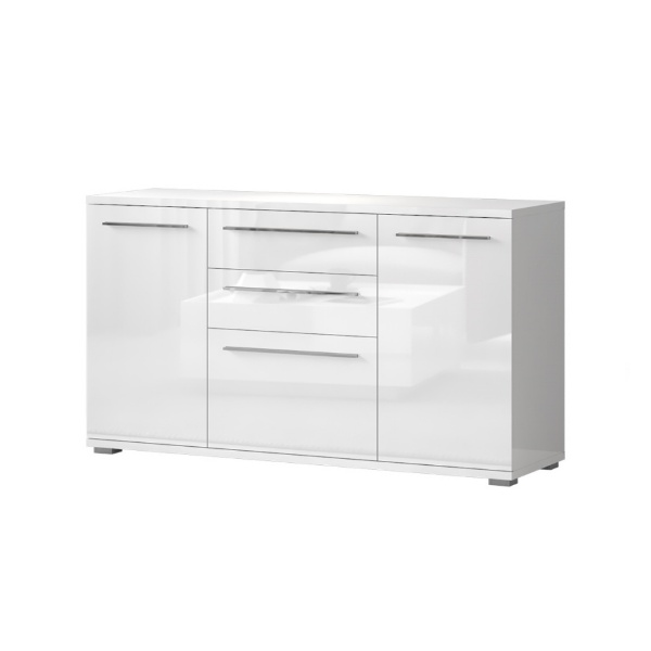 Comoda cu 2 usi si 3 sertare PIANO WHITE 150x85x45cm alb lucios, manere crom