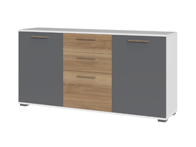 - comoda are 3 usi + 2 sertare (2 usi decor grafit mat si 1 usa + 2 sertare decor nuc Pacific)