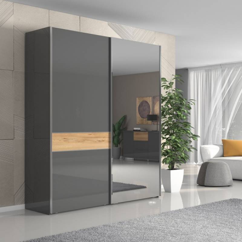 Dulap cu usi glisante ONYX 182x224x61cm antracit lucios/ nuc Pacific - oglinda, maner crom
