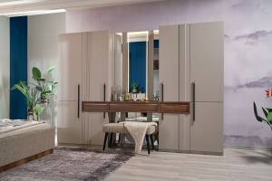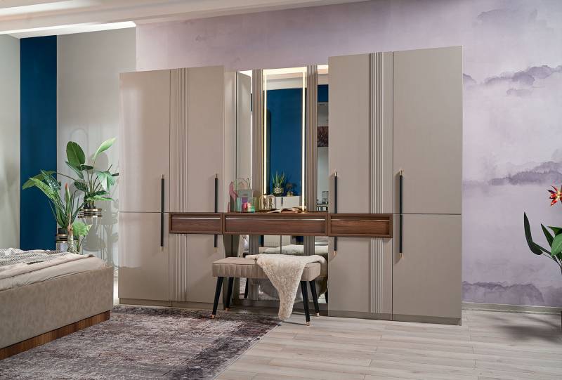 Dulap cu 12 usi cu balamale si 3 sertare SAVANORA - HENNA 324x230x60cm cu taburet inclus si oglinda