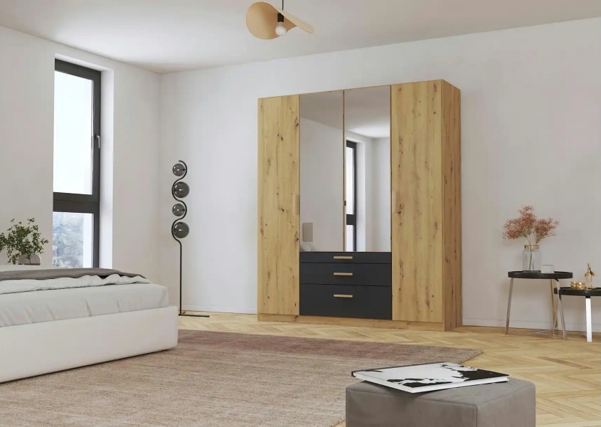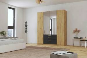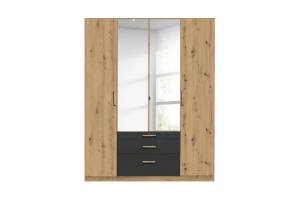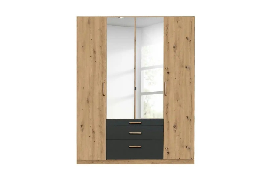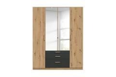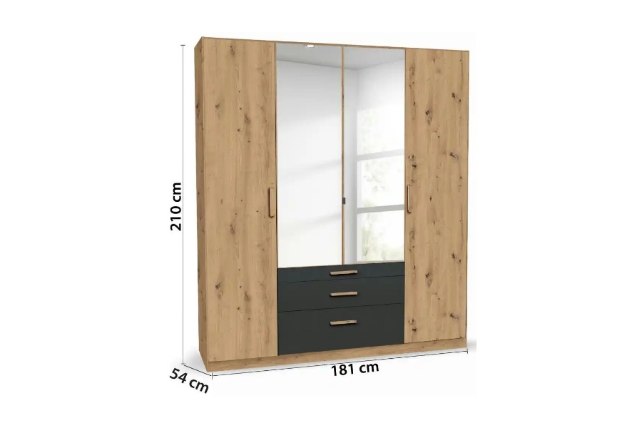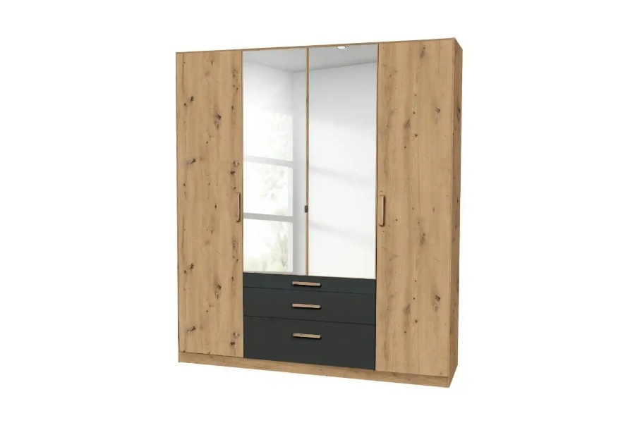 Dulap cu 4 usi cu balamale si 3 sertare MOSBACH 181x210x54cm stejar Artisan/ gri metalic - oglinda