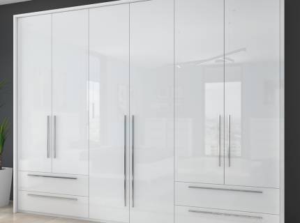 Dulap modern cu finisaj elegant gri lucios si oglinda. HOMBURG are usi gri lucios cu oglinda si carcasa gri metalic, oferind spatiu generos de depozitare. Perfect pentru interioare contemporane, adauga stil si functionalitate oricarui dormitor.