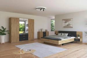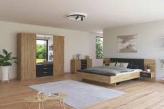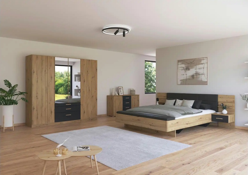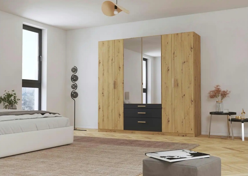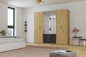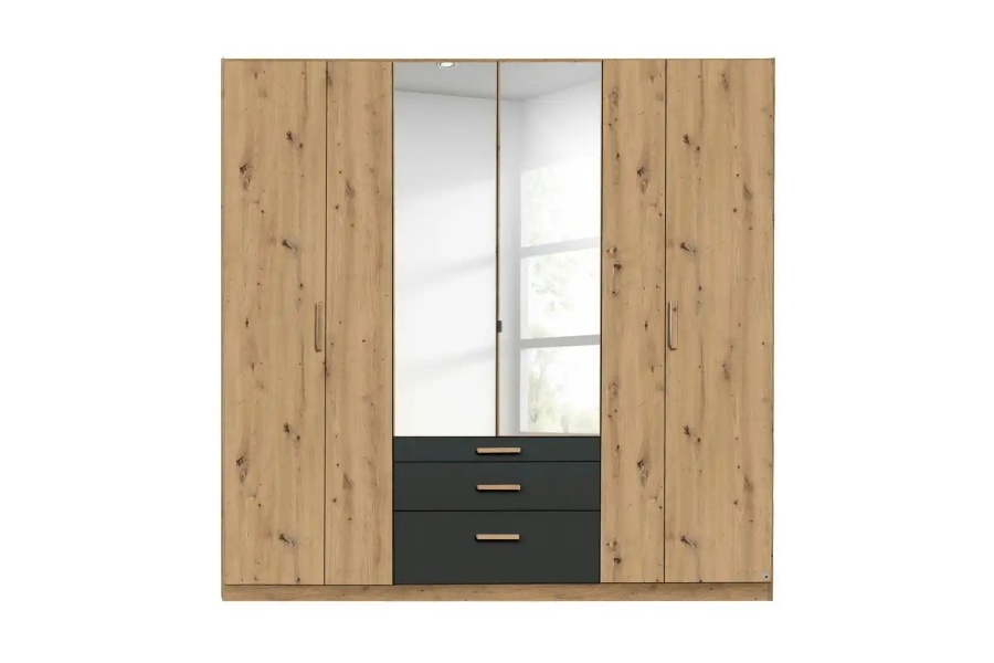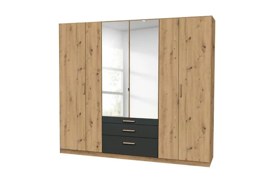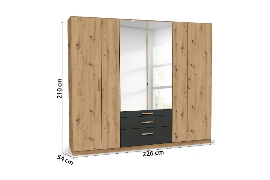 Dulap cu 6 usi cu balamale si 3 sertare MOSBACH 226x210x54cm stejar Artisan/ gri metalic - oglinda