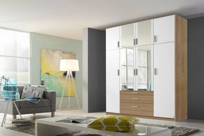 Dulap alb alpin cu carcasa si sertare stejar sonoma, oglinda. HILDESHEIM EXTRA imbina caldura stejarului sonoma cu eleganta albului alpin. Oglinda adauga luminozitate si creeaza senzatia de spatiu, fiind ideal pentru dormitoare moderne si bine organizate.