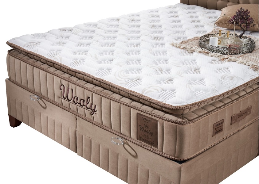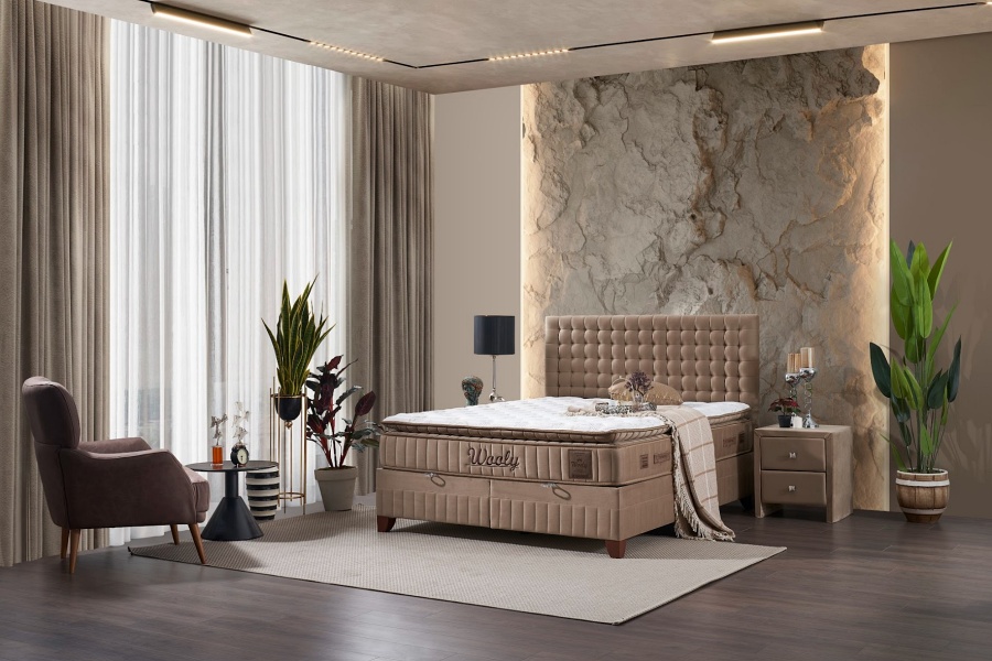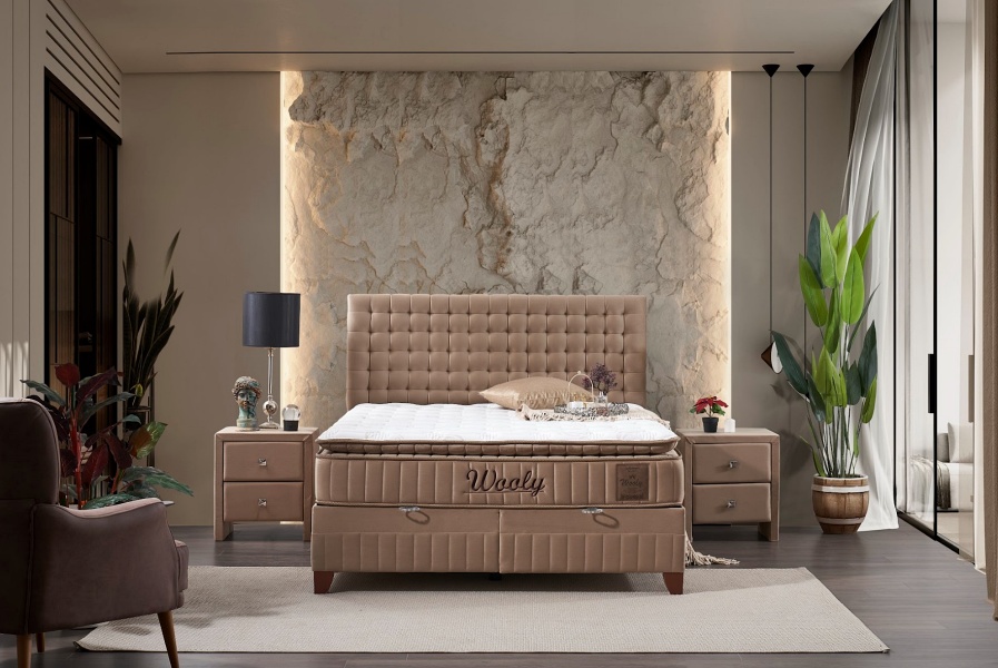 Pat tapitat cu saltea si spatiu pentru depozitare WOOLY (160x200cm) cappuccino