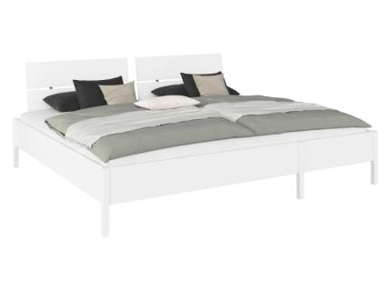 Tablia patului este tapitata cu material textil nuanta gri.