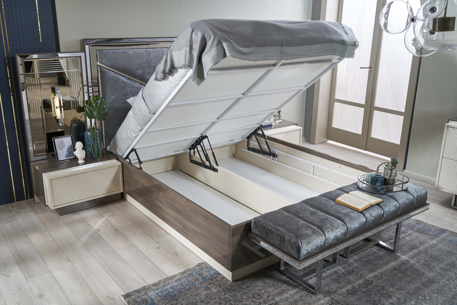 Patul este prevazut cu spatiu pentru depozitare tip lada si cu somiera (sistem de rabatare cu pistoane pe gaz)