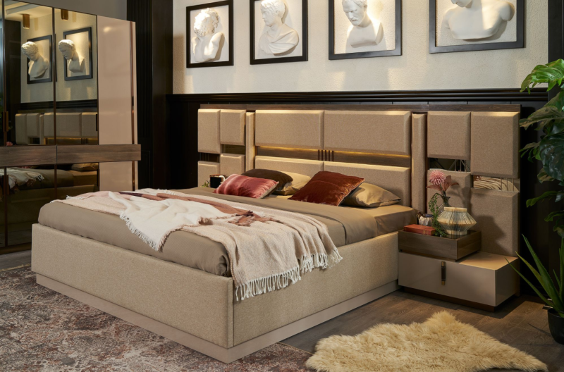 Patul este prevazut cu spatiu pentru depozitare tip lada si cu somiera (sistem de rabatare cu pistoane pe gaz)