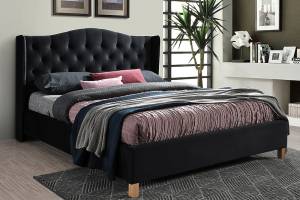Pat tapitat cu somiera ASPEN VELVET (160x200cm) catifea black, picioare nuanta lemnului