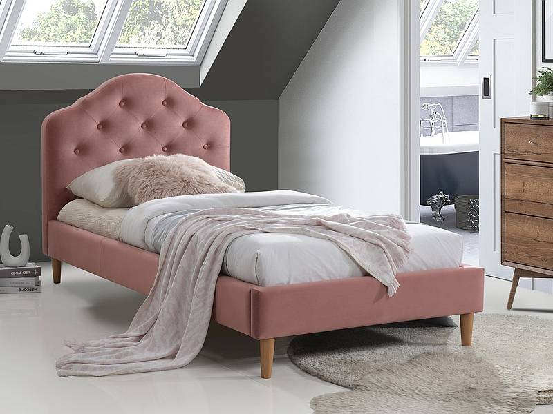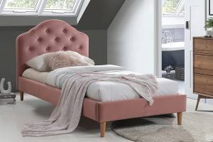 Pat tapitat cu somiera CHLOE VELVET (90x200cm) catifea somon pink, picioare nuanta lemnului