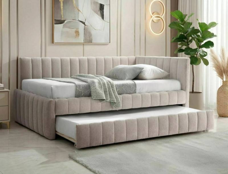 Pat tapitat cu somiera si pat suplimentar ALFIE RAVEN (120x200cm) material textil beige