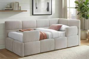 Pat tapitat cu somiera, spatiu pentru depozitare si protectii pentru pat EMMA RAVEN (120x200cm) material textil beige