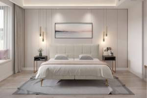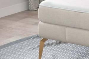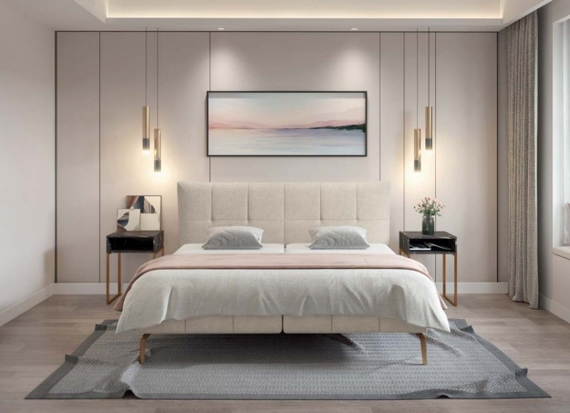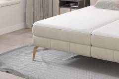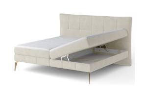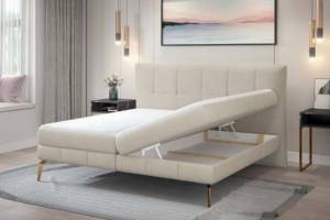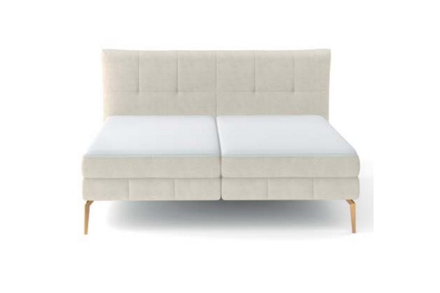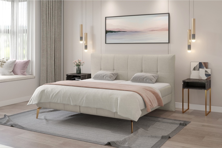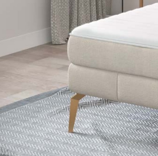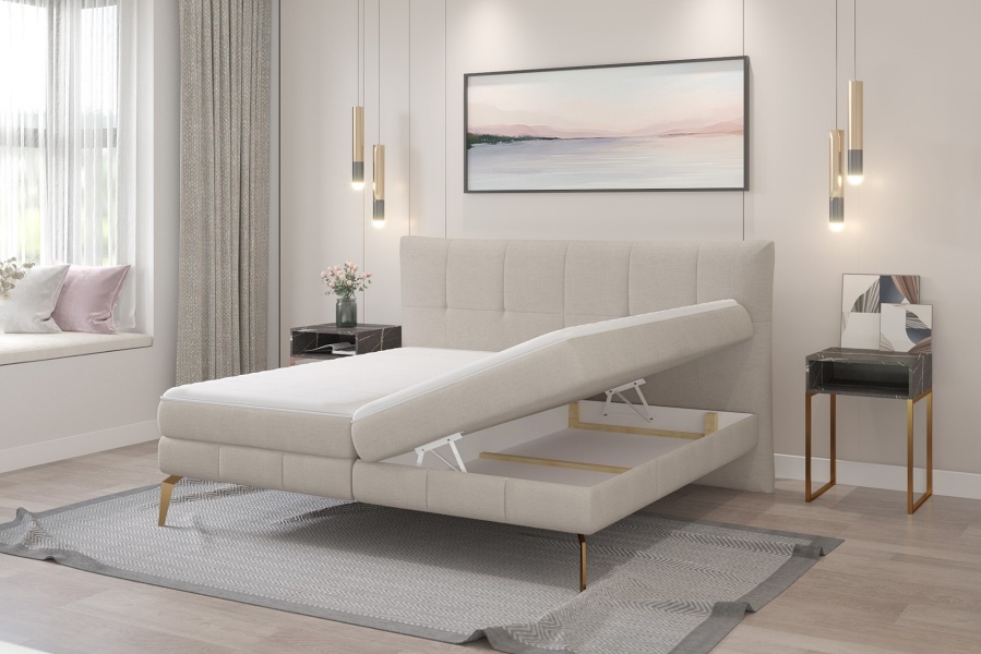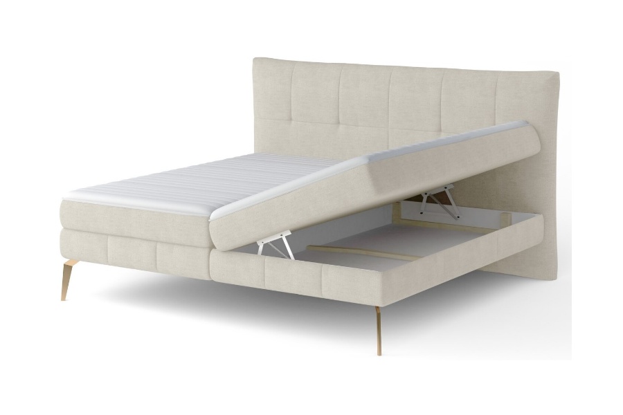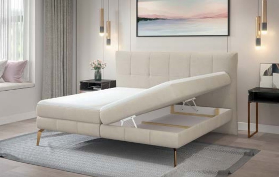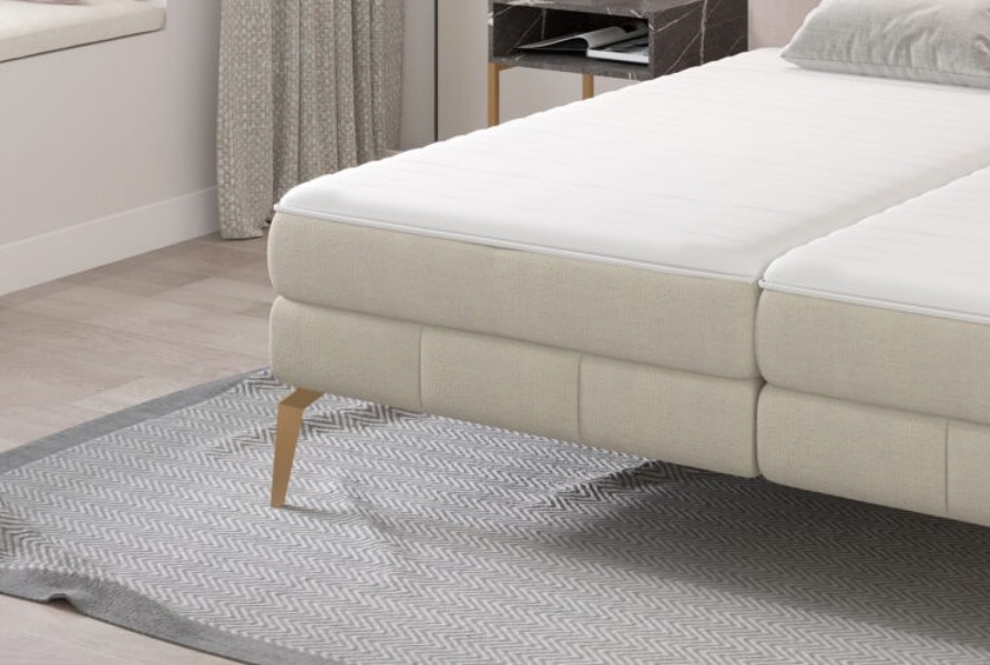Pat tapitat cu spatiu pentru depozitare, saltea si topper incorporat JOLIN 140/ 160/ 180cm personalizabil, picioare aurii