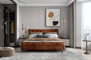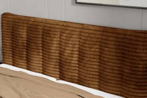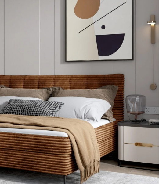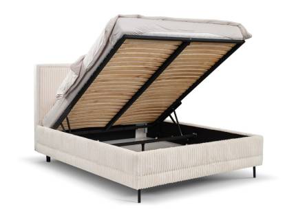 Pat tapitat cu somiera ESTELLA (160x200cm) catifea beige, picioare nuanta lemnului