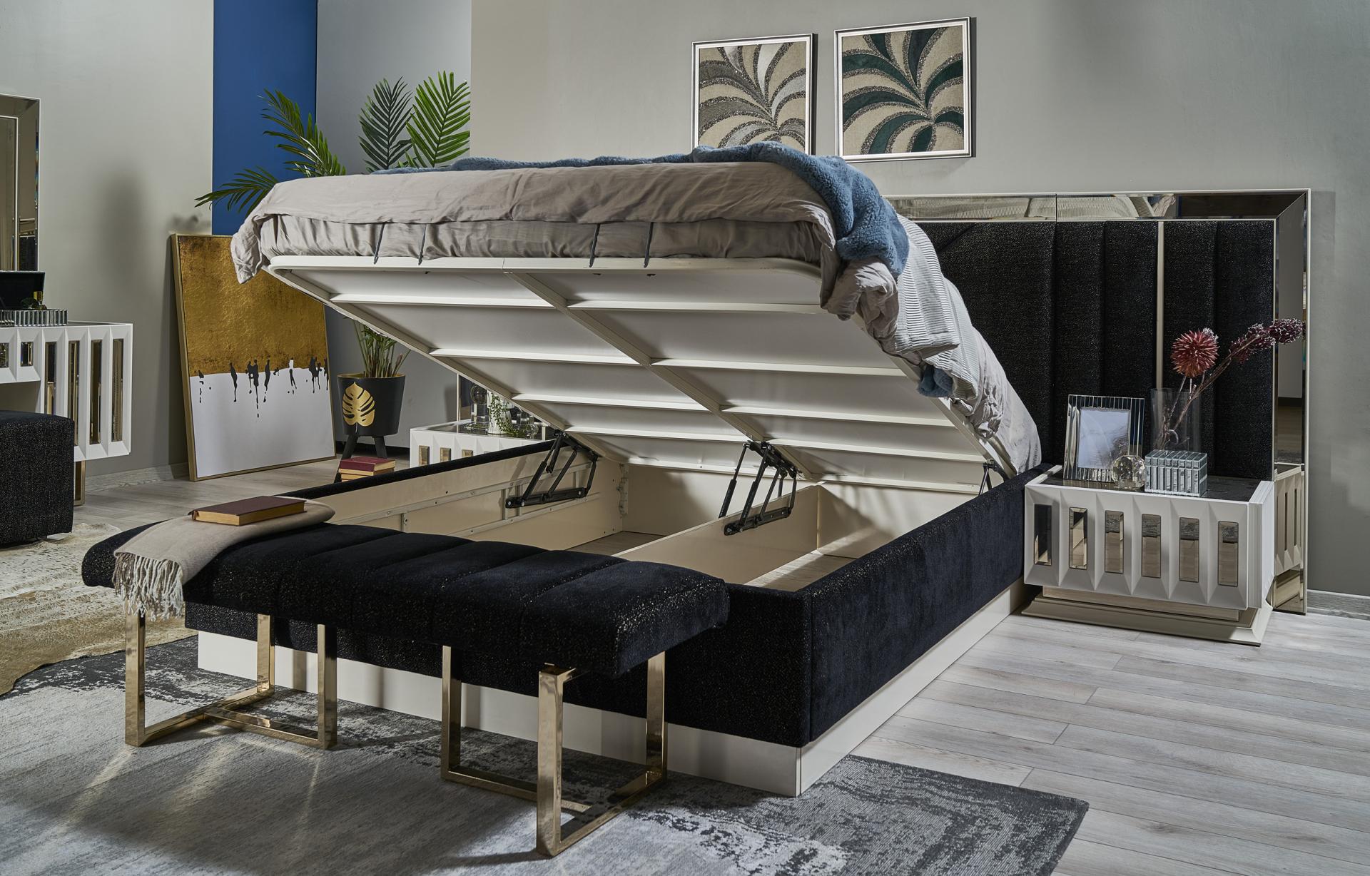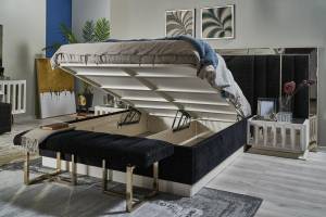 Patul este prevazut cu spatiu pentru depozitare tip lada si cu somiera (sistem de rabatare cu pistoane pe gaz)