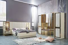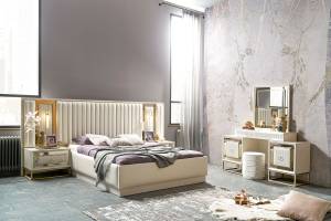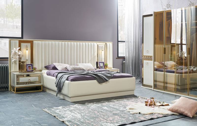 In poza de prezentare este afisat patul (160x200cm). Exista posibilitatea ca la patul (180x200cm) noptierele sa iasa in afata tabliei.
