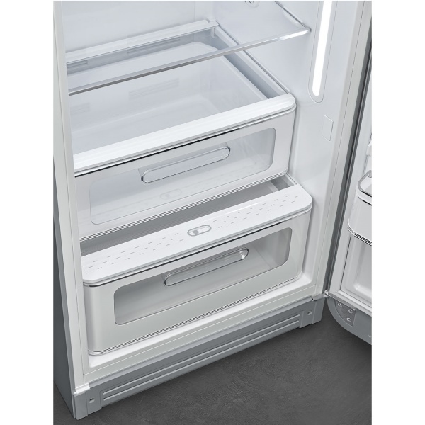 Frigider retro Smeg FAB28RSV5, in culoare speciala Lavagna, cu finisaj lucios si design rotunjit. Dispune de sistem de racire Multiflow, tratament antibacterian si maner extern fixat, oferind atat functionalitate, cat si un design elegant pentru bucataria ta.
