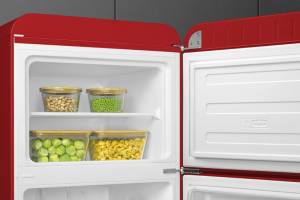 cu finisaj lucios si design rotunjit. Echipat cu maner extern fixat, iluminare LED, garnitura antibacteriana si control electronic al temperaturii, acest frigider adauga un plus de eleganta retro si performanta moderna in bucataria ta, fiind ideal pentru un spatiu sofisticat si eficient.
