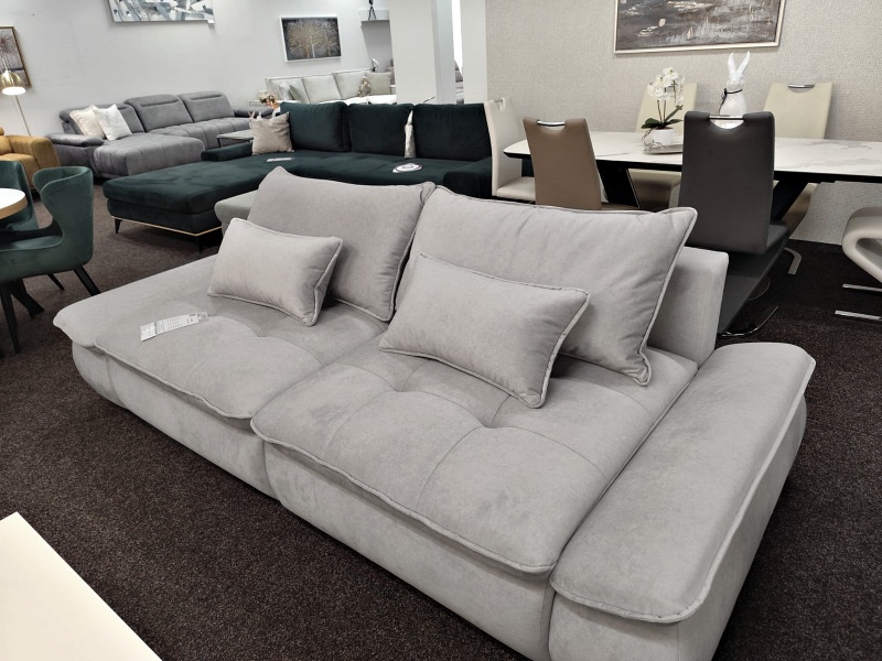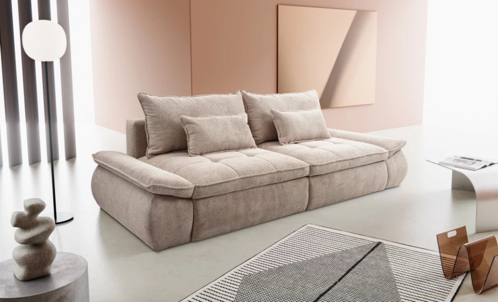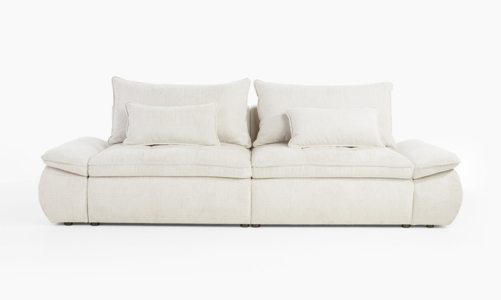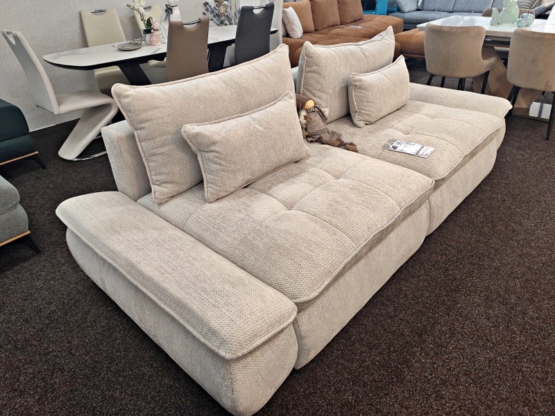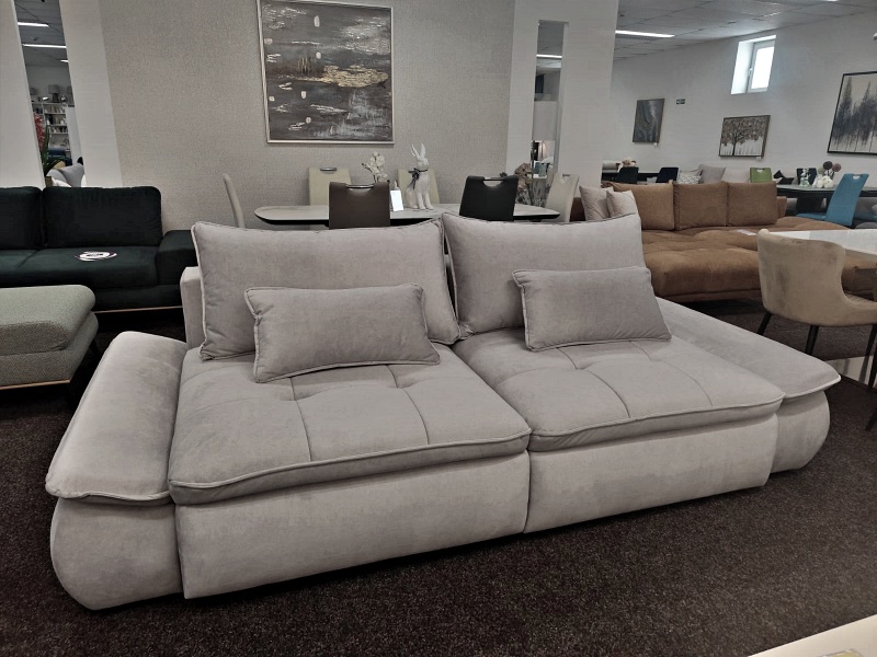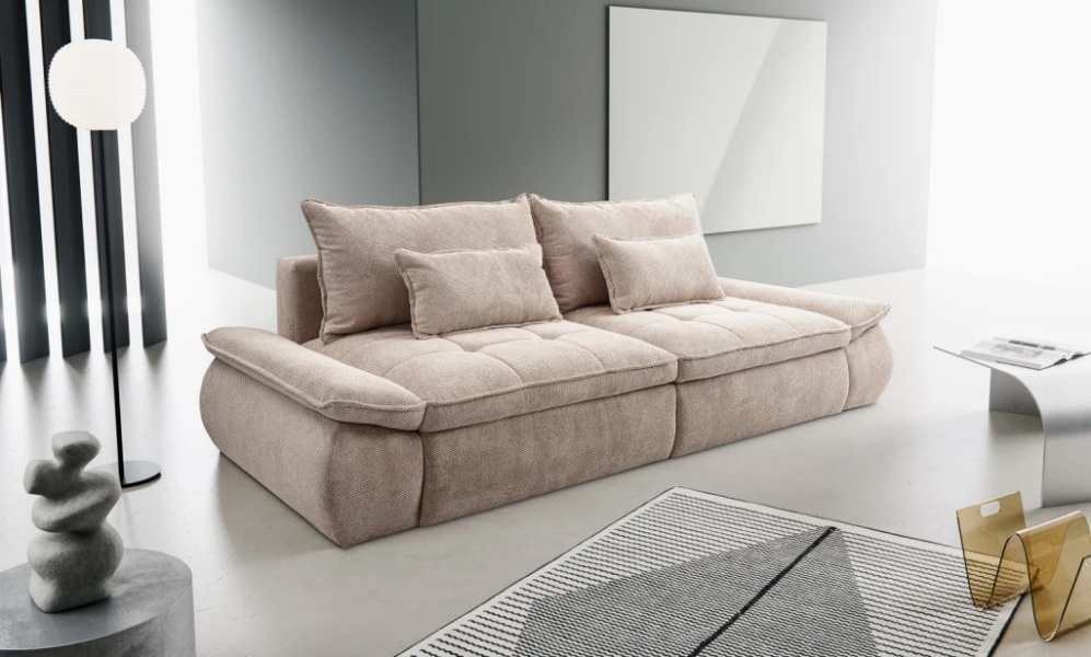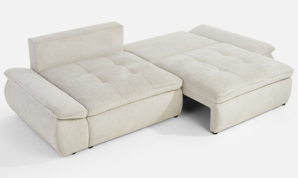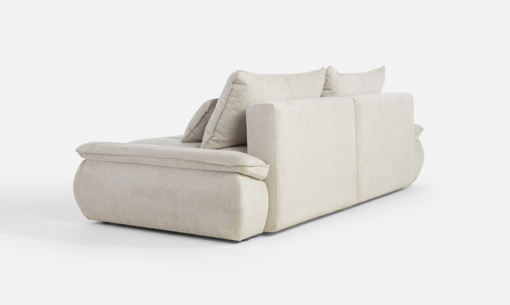 Canapea extensibilă modernă, cu 2 perne mari și 2 perne mici incluse și extensie tip doppel liege. Modelul NUBE oferă confort sporit și un design funcțional, perfect pentru un spațiu relaxant și practic.