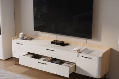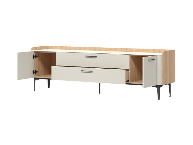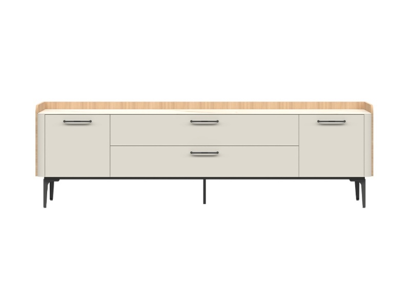 Comoda tv cu 2 usi si 2 sertare AIR 209x63x47cm Pepper White/ stejar Furneo - sticla cu model de marmura Calcatta Oro, cadru, picioare si manere Antracit