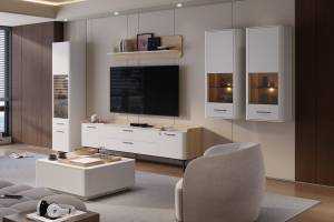Pretul afisat nu include comoda TV, coprurile suspendate, masuta, montajul, alte piese de mobilier si accesoriile din imaginea de prezentare a produsului.