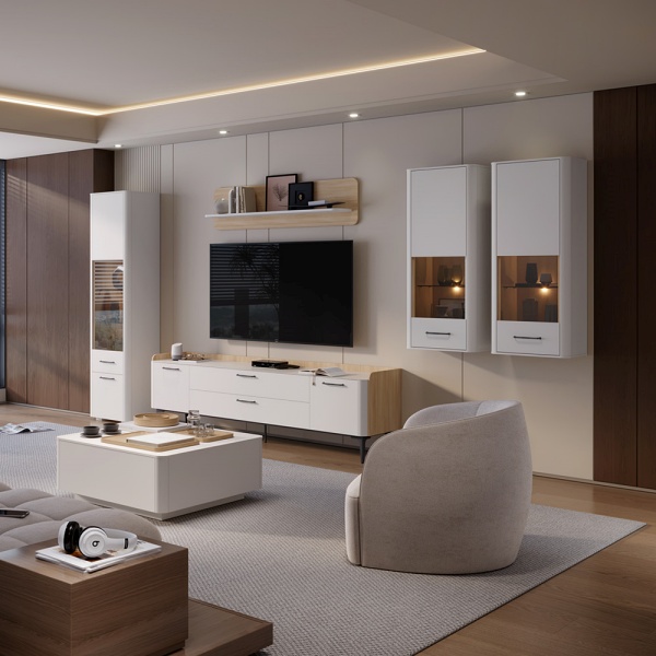 Pretul afisat nu include comoda TV, coprurile suspendate, masuta, montajul, alte piese de mobilier si accesoriile din imaginea de prezentare a produsului.