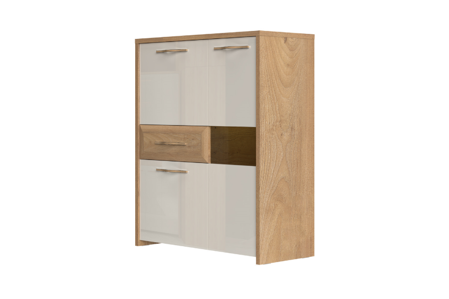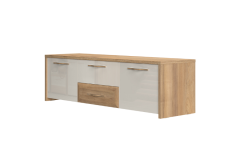 - partea frontală a sertarelor inferioare este din MDF profilat cu folie în decor lemn nuc Pacific