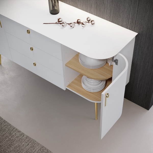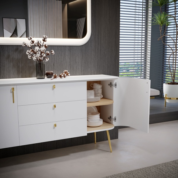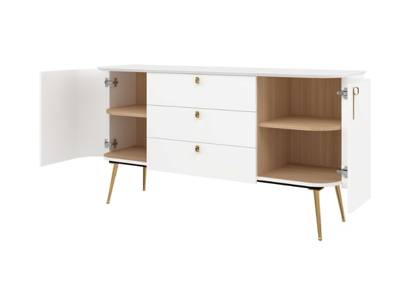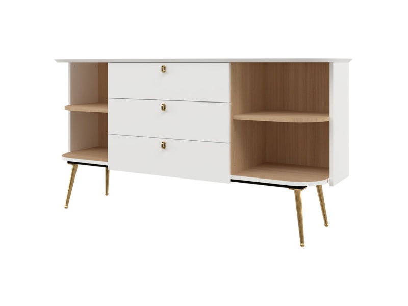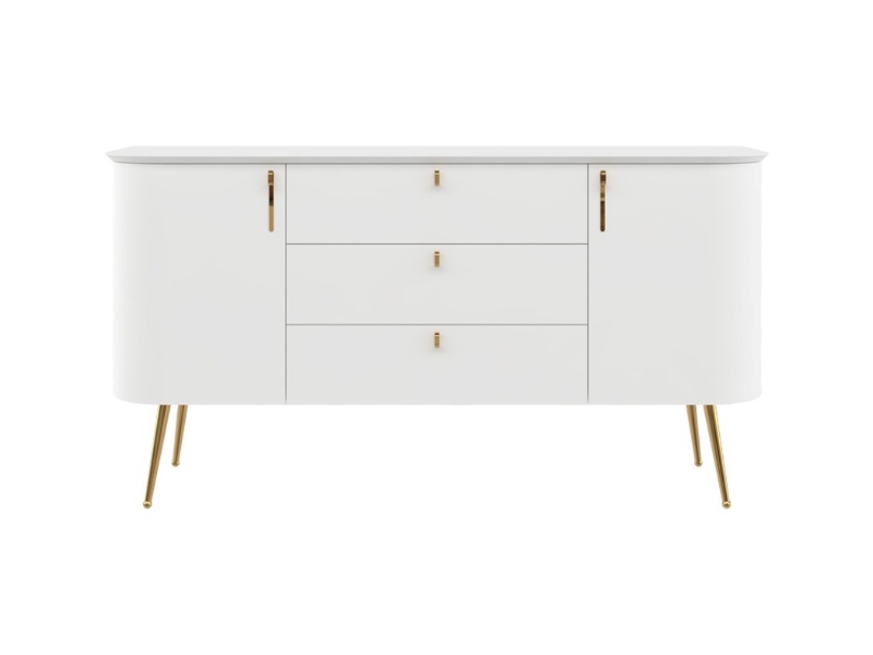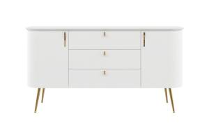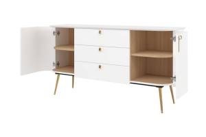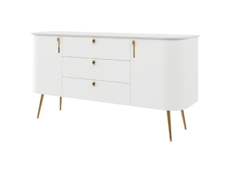 Comoda cu 2 usi si 3 sertare GALET 158x82x47cm alb mat, picioare si manere auriu neon