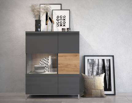 Vitrina cu 2 usi si iluminare LED ONYX 92x117x40cm antracit lucios/ nuc Pacific - sticla, manere si picioare crom