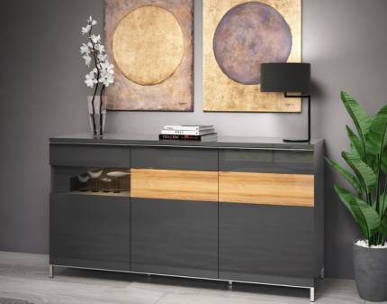 Comoda 3 usi si sticla si 1 sertar ONYX 167x88x45cm antracit lucios/ nuc Pacific - sticla, manere si picioare crom