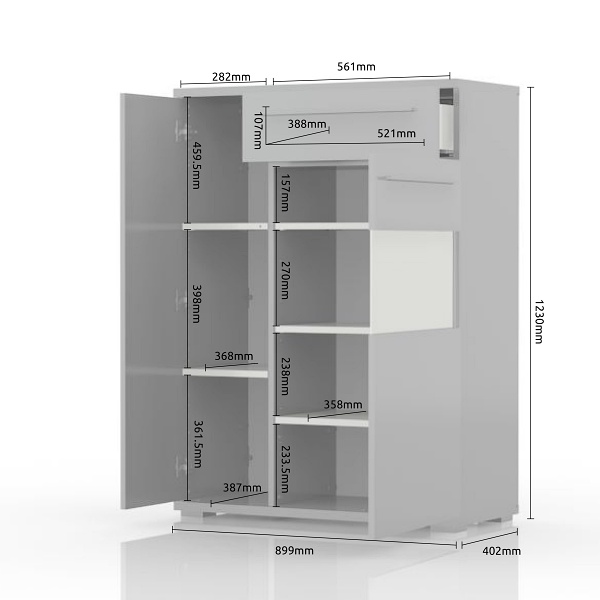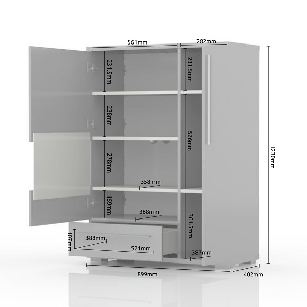 - doua usi si un sertar, decor beige lucios, detalii din sticla