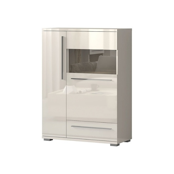 Vitrina lata cu 2 usi cu sticla si 1 sertar PIANO BEIGE 90x123x40cm bej lucios - sticla, manere si picioare crom