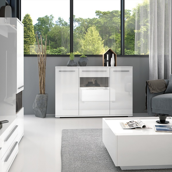 Comoda cu 3 usi cu sticla PIANO WHITE 150x85x45cm alb lucios - sticla, manere si picioare crom