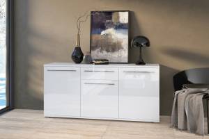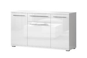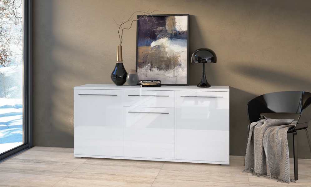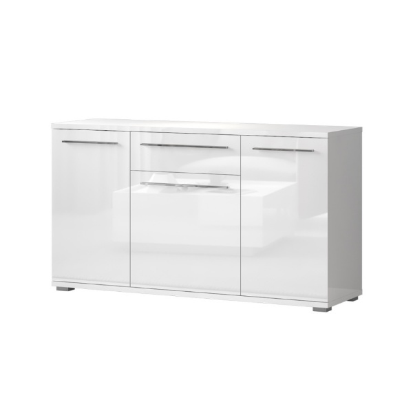 Comoda cu 3 usi si 1 sertar PIANO WHITE 150x85x45cm alb lucios, manere si picioare crom